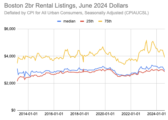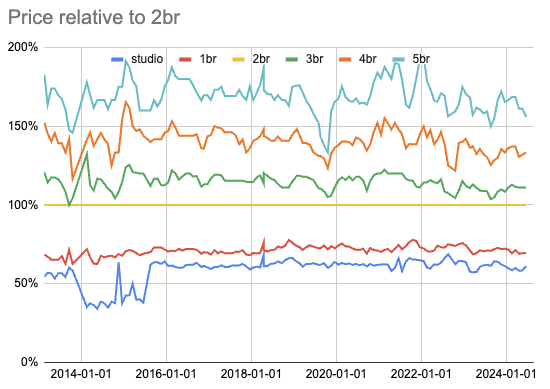 Looking at median prices for each size apartment, relative pricing seems pretty similar.