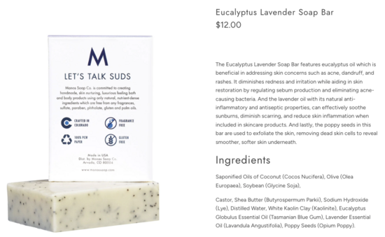 Note that some products will say "unscented", but still have fragrances. This is very confusing, but the basic idea is that an "unscented" product is intended not to smell like anything, and might include "masking fragrances" to cover the scents of the ingredients. Products that say "fragrance free" are a better bet, but the term is not heavily regulated and there are products out there like this eucalyptus lavender soap bar that say "free from any fragrances" but also have strongly scented essential oils: