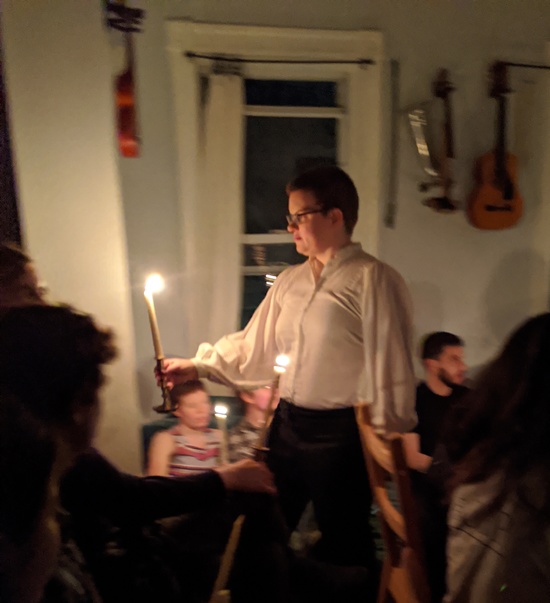 When it was time to start I realized that my publicity had just listed "7pm" as a start time and not distinguished between "when it's ok to show up" and "when we're going to start". A better way to do this would have been something like "doors open 6:30, solstice starts 7:15".