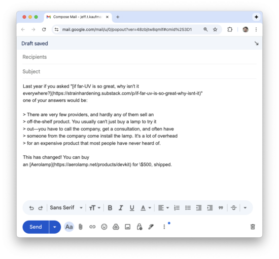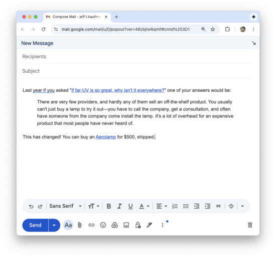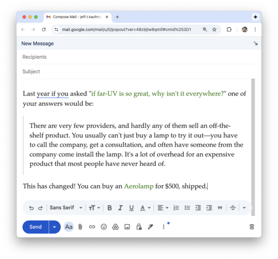 Let's say I want to send someone a snippet from a blog post. If I paste this into my email client the font family, font size, blockquote styling, and link styling come along: