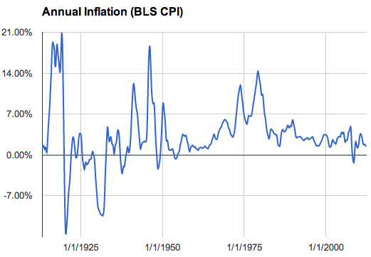 I often think that because inflation is around 2% these days I don't need to pay much attention to it. If a number is from 1970 I'll go look up the conversion to adjust for inflation but if someone compares 2003 numbers to 2013 I figure it's not that important. If you just assume all relatively recent monetary values you see are in current dollars, how far wrong will you go? It turns out this can matter a lot: dollars lost a quarter of their value from 2003 to 2013. So here's a chart of the inaccuracy of this assumption when considering numbers from the past 30 years: