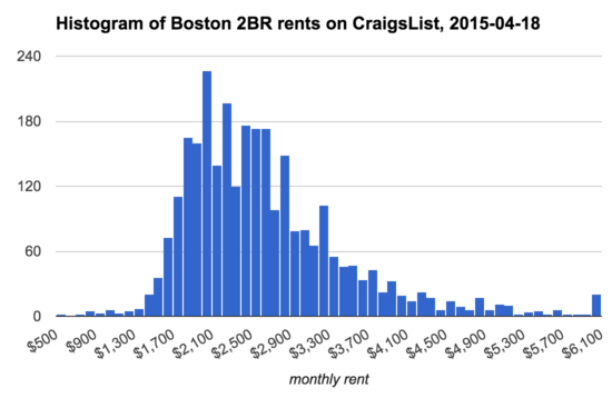 On the other hand, if you look at the apartment listings on CraigsList you'll see basically no 2br apartments that cheap. Looking over all 2801 two bedroom apartments listed there [1] the 40th percentile is $2,250: