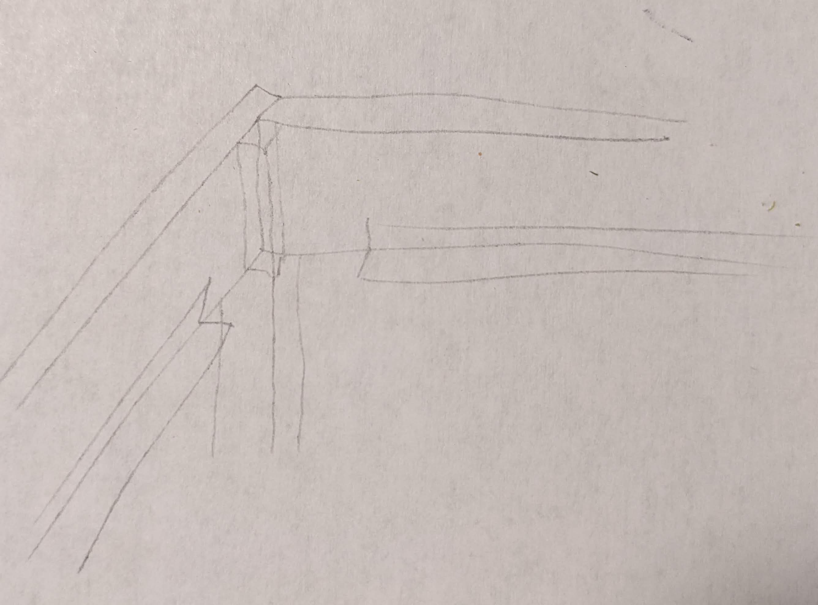 The goal is to make sure I know what all the lines are and about where things fit together. Sometimes I need to do a few rounds of these, but they're fast enough this isn't much a problem. Lines that are vertical in real life go up and down, lines that are horizontal and perpendicular to me go across the page, and lines that would be coming out of the page instead go down and to the left.
