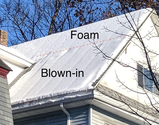 One way to see how well this worked is to look at snow on the house. I don't have pictures from before we put in any insulation, but my memory is that the roof generally melted the snow rapidly by retaining very little heat. I do have pictures, though, from (1) after we had the foam but before we blew in insulation, and (2) today: