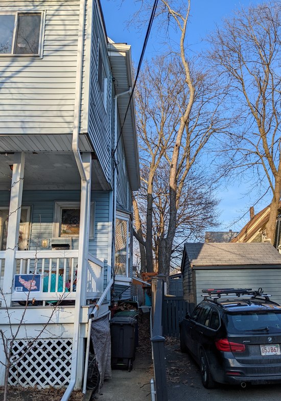 This roof is a good candidate for solar, with one problem: the panels might avalanche snow onto the neighbor's car: